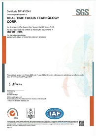 Real Time Focus Technology Corp., who is a leading Printed Circuit Board manufacturer in Taiwan and has been upgraded the quality system from ISO/TS 16949:2009 / IATF 16949:2016 (IATF,International Automotive Task Force) to AS9100:D / JISQ 9100:2016 / EN 9100:2018.